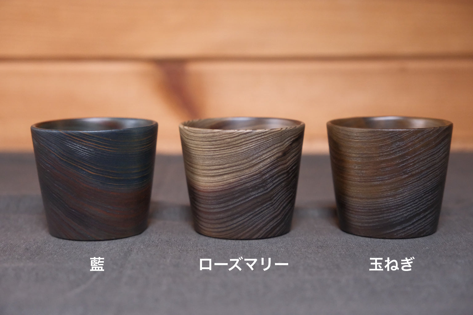 染めの発色には木目によって個体差があるのであらかじめご了承ください(写真の藍はかなり派手な木目のものです)。また、光のあたり方によっても色の見え方が大きく異なります。